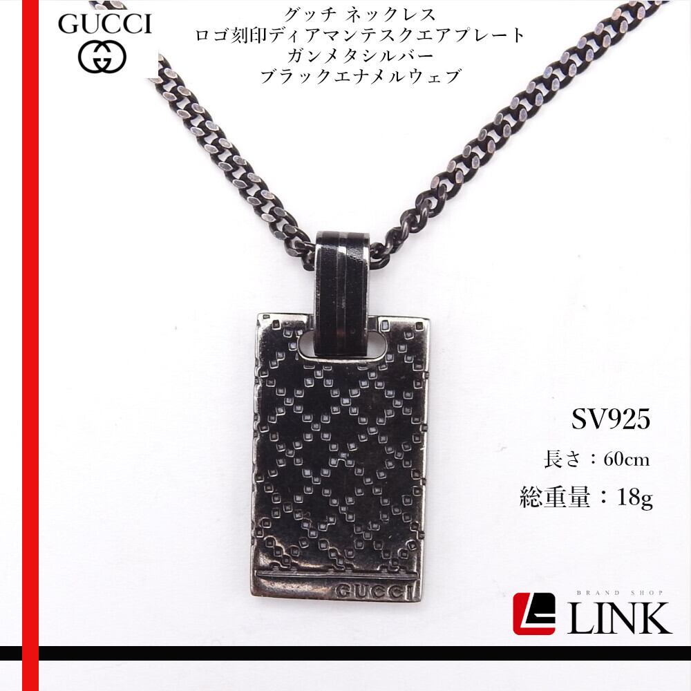 GUCCI グッチ ネックレス ロゴ刻印ディアマンテスクエアプレート ガンメタシルバー ブラックエナメルウェブ SV925 アクセサリー メンズ レディース