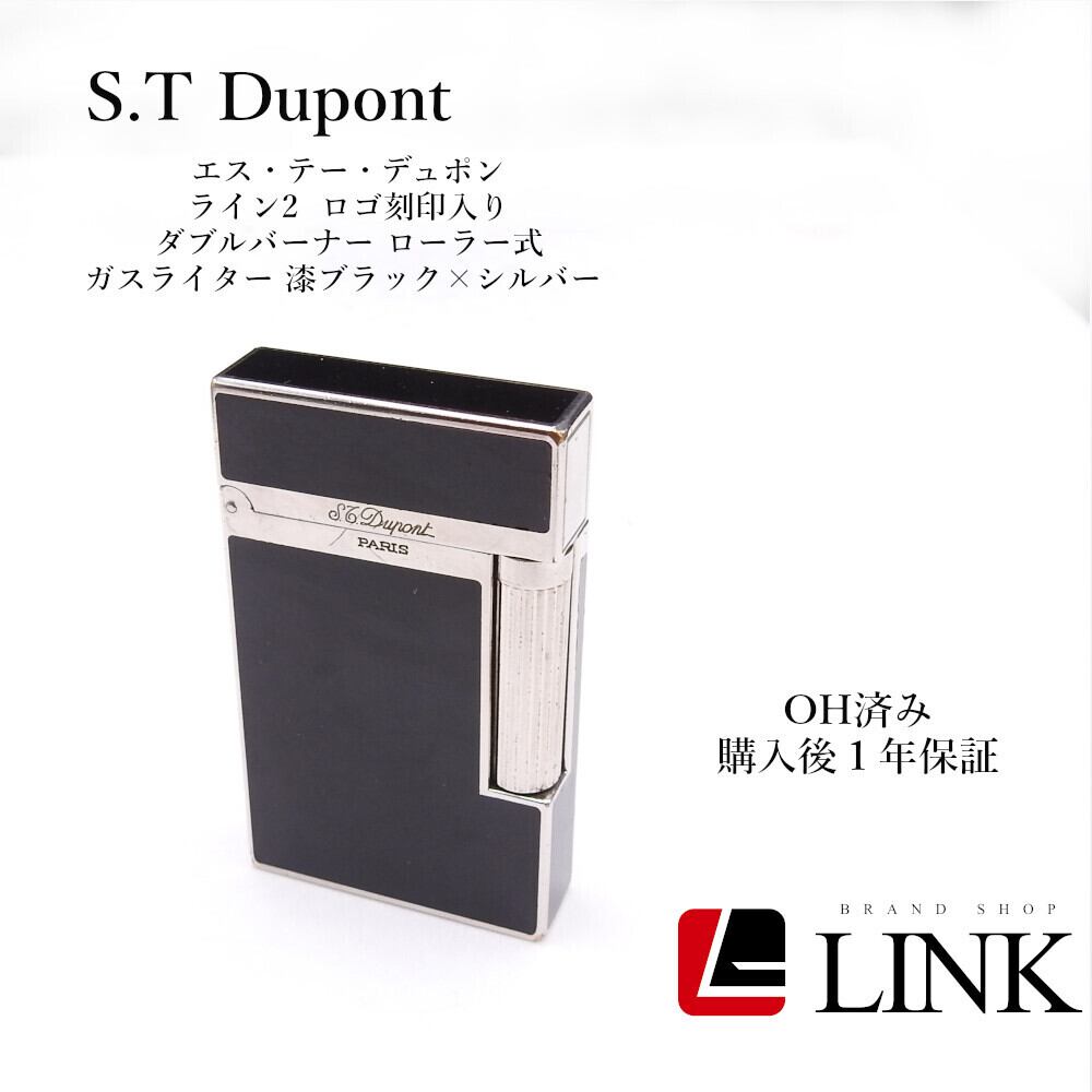 OH済み 【着火確認済み】S.T Dupont エス テー デュポン ライン2 ロゴ刻印入り ダブルバーナー ローラー式 ガスライター 漆ブラック×シルバー