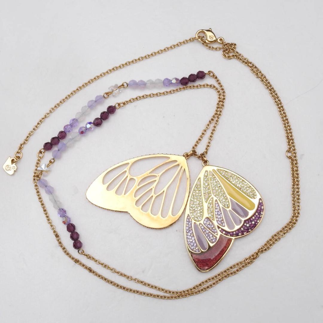 スワロフスキー バタフライモチーフ ロングチェーンネックレス ビーズ付 ゴールド