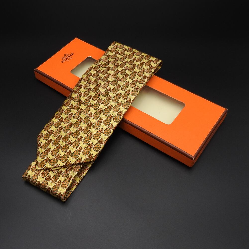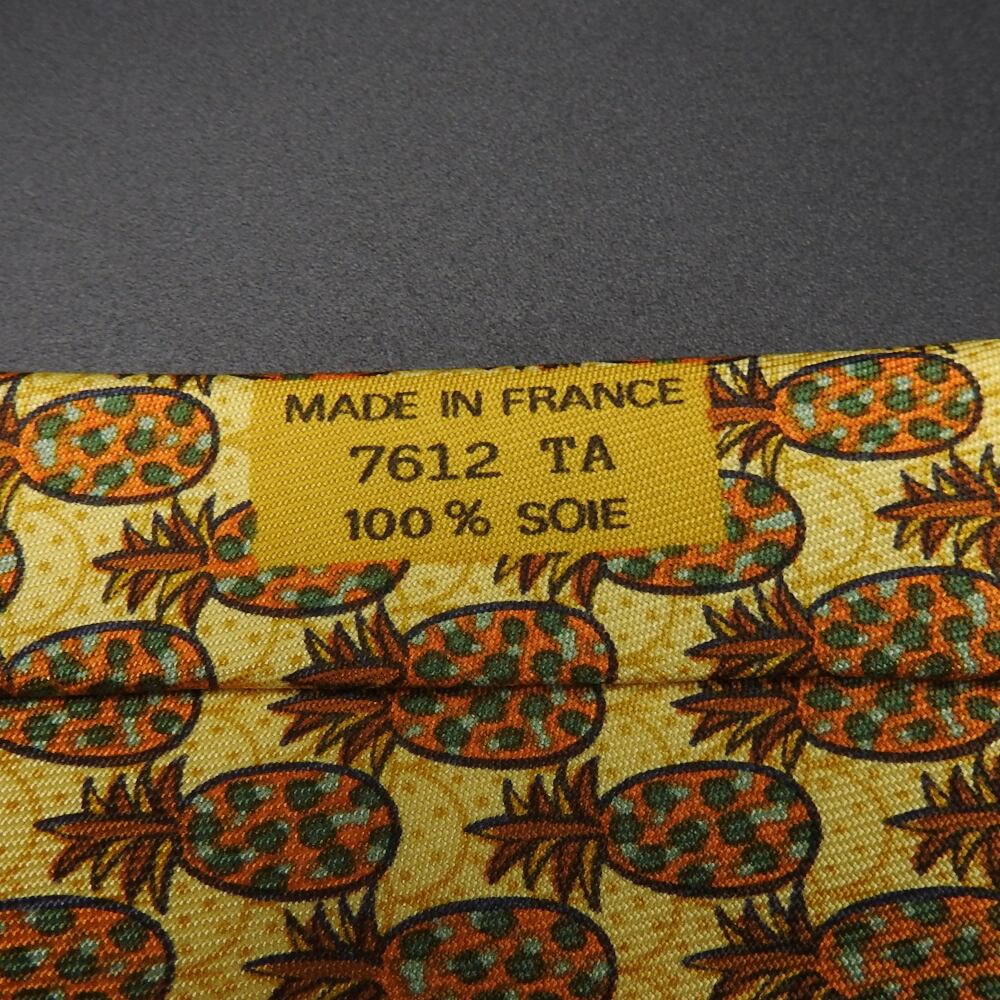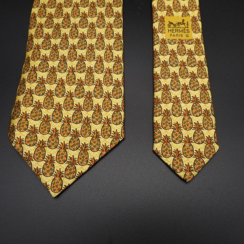 最高級シルク100%【正規品】エルメス HERMES ネクタイ パイナップル柄 イエロー系 メンズ シルク ビジネス カジュアル