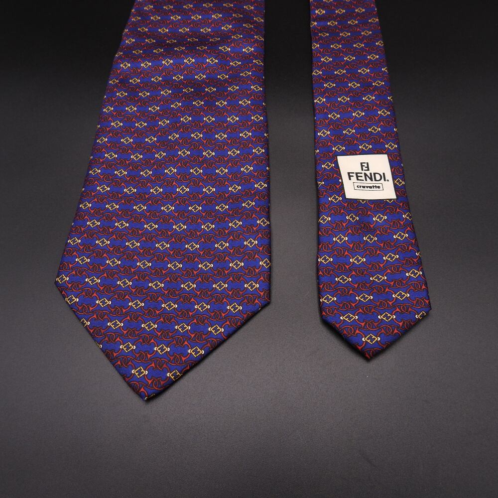 最高級シルク100%【正規品】フェンディ FENDI ネクタイ シルク イタリア製 レッド×濃いネイビー 総柄
