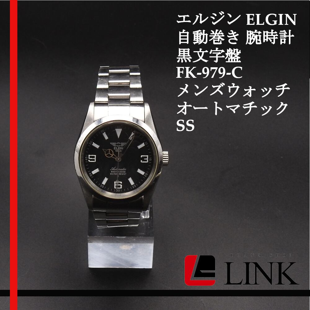 稼働確認済み エルジン ELGIN 自動巻き 腕時計 黒文字盤 FK-979-C AT メンズ ウォッチ オートマチック SS