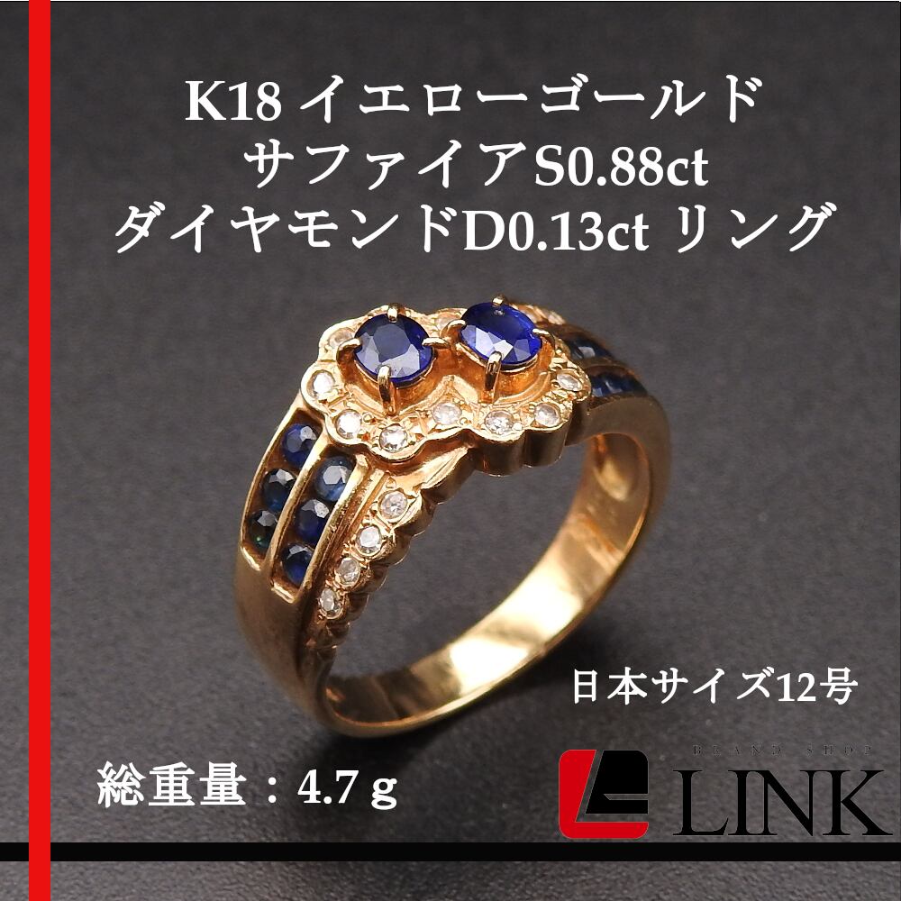 【美品】 K18 サファイア S0.88ct ダイヤモンド D0.13ct 4.7g リング 日本サイズ12号 イエローゴールド デザインリング 指輪 レディース アクセサリー