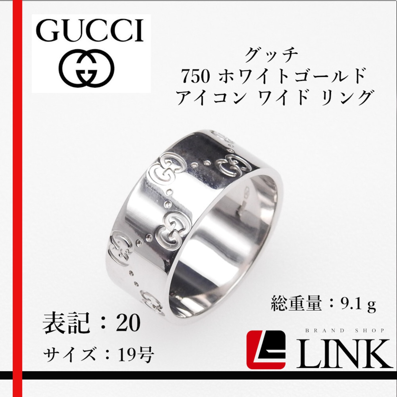 【正規品】グッチ GUCCI 750 K18 ホワイトゴールド アイコン ワイド リング 表記20 指輪 (実寸19号弱) 約9.1g 刻印あり アクセサリー