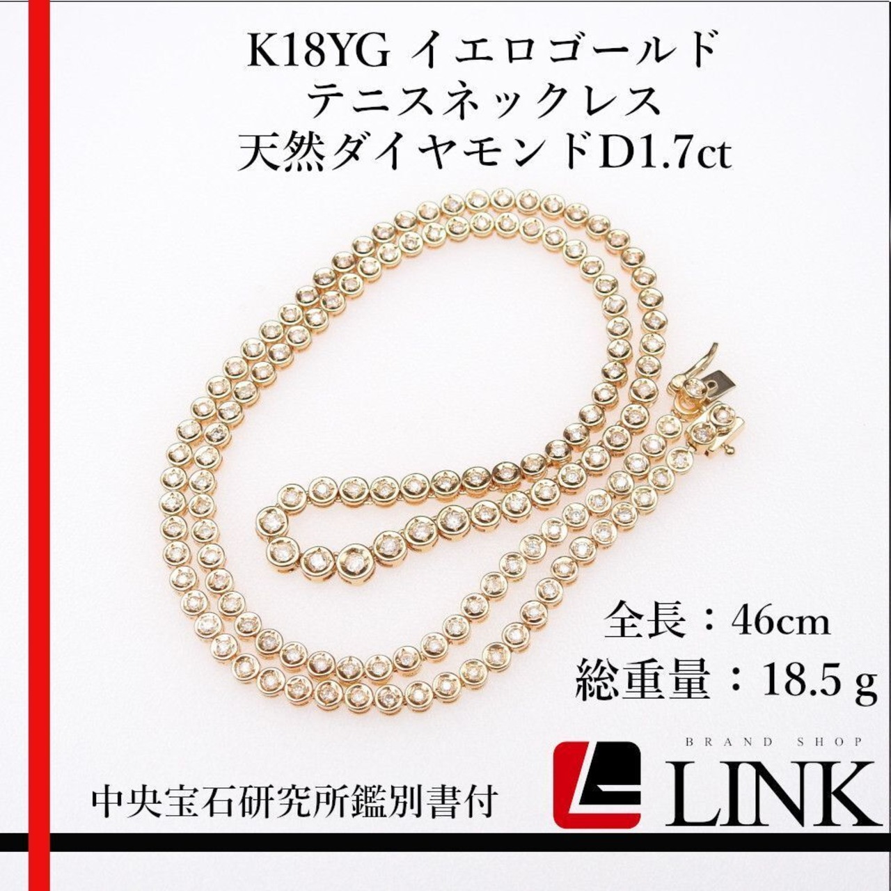 【美品】K18YG イエローゴールド テニスネックレス 天然ダイヤモンド D1.7ct 中央宝石研究所鑑別書付 レディース 豪華