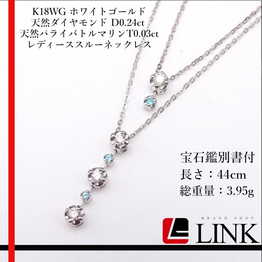 K18WG ホワイトゴールド 天然ダイヤモンド D0.24ct 天然パライバトルマリンT0.03ct レディーススルーネックレス