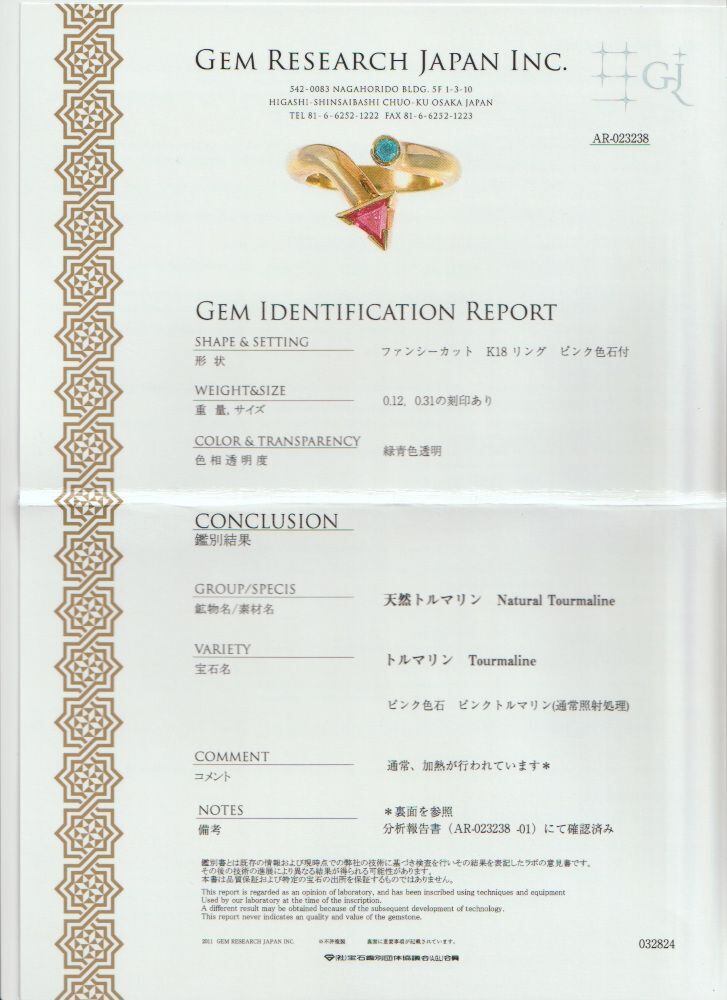 【希少品】18K イエローゴールド 天然パライバトルマリン 0.12 ピンクトルマリン PT 0.31 レディースリング